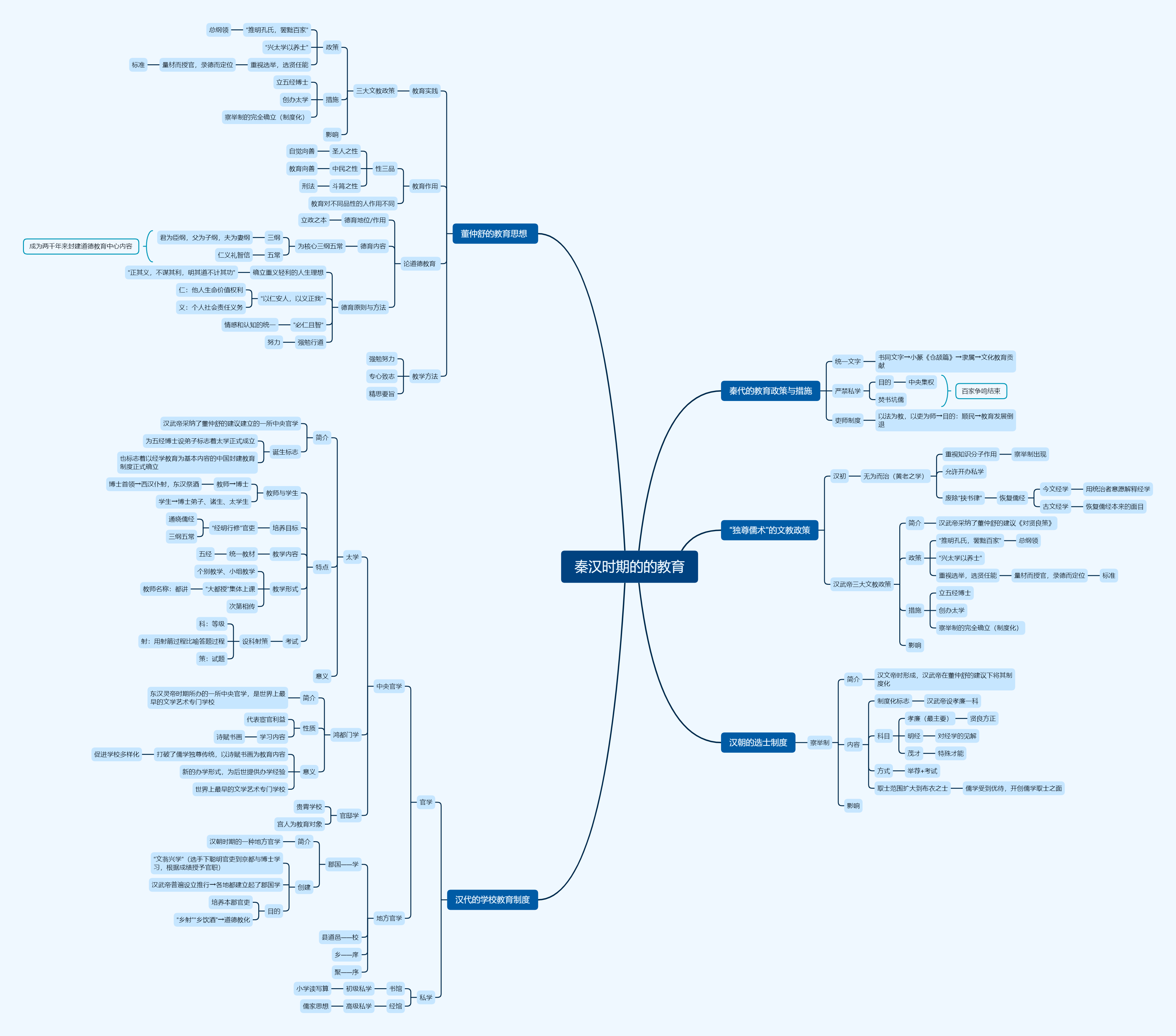 秦汉时期的文教政策 识记 秦代文教政策的基本内容 ①书同文:以小篆为统一的文字标准。 ②行同伦:(统一道德规范) ③设三老以掌教化 ④禁止私学,焚书坑儒 ⑤以法为教、以吏为师。 统一文字:“书同文字”→小篆《仓颉篇》→隶书→文化教育贡献 严禁私学 目的:中央集权 焚书坑儒 吏师制度:以法为教,以吏为师→顺民→教育发展倒退 汉初黄老政治对文教政策的影响 ①重视知识分子的作用。汉初较为宽松的文化政策使知识分子群体及文化活动再度兴盛,有百家争鸣之遗风。儒家学派得以发展起来,为汉武帝时儒学独尊莫定了基础。 ②允许开办私学,…